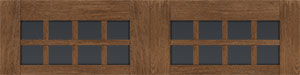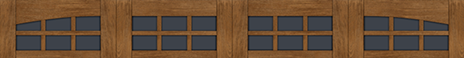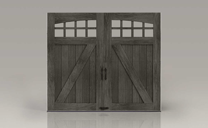 Insulated carriage house garage doors with faux wood-look composite overlays.